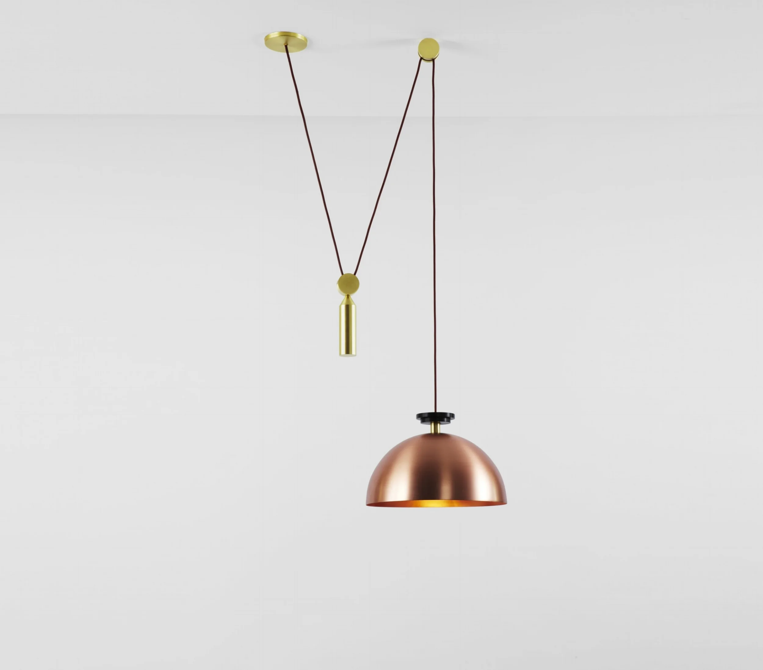 Versatile pendant lighting in a choice of five primary shade shapes: Metal cone, metal dome, glass sphere, cylinder, and arc. All pendants are adjustable in height at any time via the solid brass counterweight and pulley hardware.